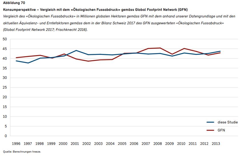 In December 2006, Switzerland became the first country to work with Global Footprint Network to examine and understand its Ecological Footprint and biocapacity results. Since then, more than a dozen other countries have followed suit. The Swiss government published the initial review in a report titled Switzerland’s Ecological Footprint – A Contribution to the Sustainability Debate. The report and its technical background study were written by INFRAS, a leading Swiss policy research institute., By comparing the international data sources used by Global Footprint Network to the statistics used by the Swiss Federal Statistical Office, they concluded that the data sets were largely consistent. A second review in 2018 reconfirmed Global Footprint Network’s results with a very small margin of difference (shown in Figure 70 on page 87 of the technical report).