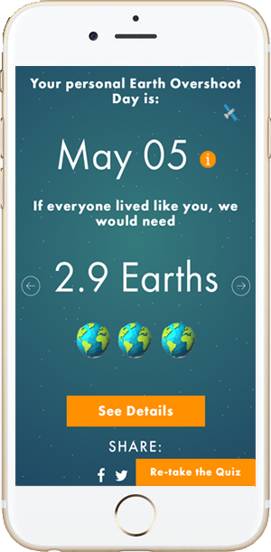 The new Footprint Calculator allows users to measure their own demand on nature (Ecological Footprint) and assess their personal Earth Overshoot Day. A user’s personal Earth Overshoot day is the date Earth Overshoot Day would be if all people had their Footprint.