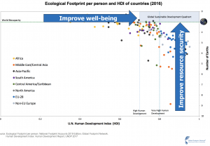 In 2019, Schneider Electric and Global Footprint Network teamed up to invite business leaders to assess how one-planet compatibility strategies can deliver differentiation and value in the market. One-planet companies are those companies whose goods and services contribute to humanity’s demands on nature being in balance with what Earth’s ecosystems can provide.More specifically, those companies whose business models increase human well-being while also increasing resource security (see graph) are much more likely to be economically successful in the long-run than those companies that are incompatible with one-planet prosperity and will inevitably face shrinking demand and increasing risks.