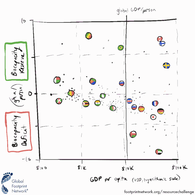 To maintain progress and eradicate poverty, countries need either sufficient natural resources within their country to match their Ecological Footprint, or money to competitively buy what they need on markets abroad. When neither of these two conditions are met, countries may end up in an ecological poverty trap — a situation in which the country’s natural resources are insufficient to provide enough food, fibres, building materials and CO2 sequestration, among other factors.