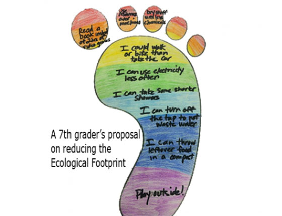 Footprint Drawing: Suggest ways to reduce your Ecological Footprint in a drawing like the one by a seventh grader at left.
