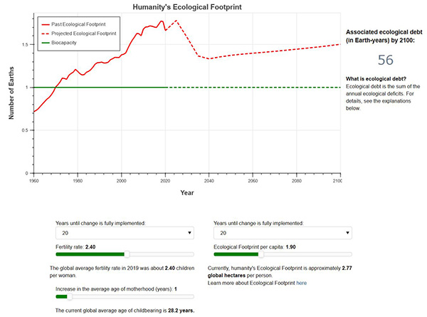 Play with our global Footprint scenario tool and design possible futures for humanity. Choose key parameters that shape overshoot: how much each of us use, how many of us there are on the planet, and how quickly changes in consumption and family size are implemented. The tool then displays how your choices would affect humanity’s trajectory.